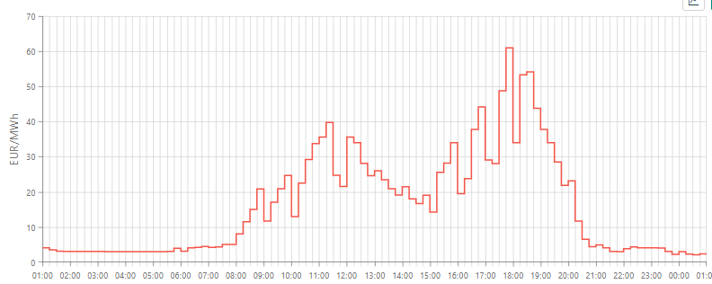 Taas kulutuksen ja hintojen laskiessa, esimerkiksi iltapäivällä tai hiukan myöhemmin illalla, tunnin ensimmäinen neljännes erottuu kalliina hyppyrinä.