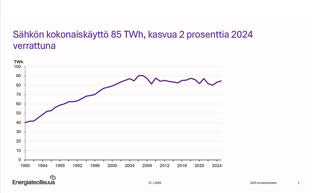 Suomi käytti sähköä viime vuonna 84,6 terawattituntia. Tämä on 1,9 prosenttia enemmän kuin vuotta aikaisemmin.