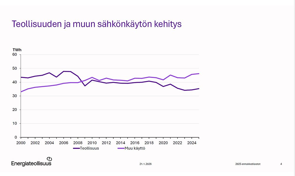 Sähkönkäyttö kasvoi kaikilla sektoreilla hitusen. Sähkökakusta teollisuus käytti 35,3 terawattituntia, mikä on 2,6 prosenttia enemmän kuin vuonna 2024. ”Muu kulutus” — kotitaloudet, palvelut, maatalous — oli 49,3 terawattituntia. Tämä on 1,4 prosenttia enemmän kuin vuosi sitten.