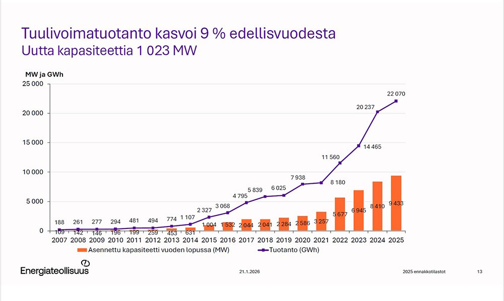 Tuulisähköä tuotettiin 22 terawattituntia viime vuonna. Tämä on 9,1 prosenttia enemmän kuin vuotta aikaisemmin. Tuuliolosuhteet vaikuttavat tuulisähkön määrään, mutta myös se, kuinka paljon uusia tuulivoimalaitoksia rakennettiin edellisenä vuonna. Viime vuonna uutta tuulivoimalaitoskapasiteettia rakennettiin tuhat megawattia.