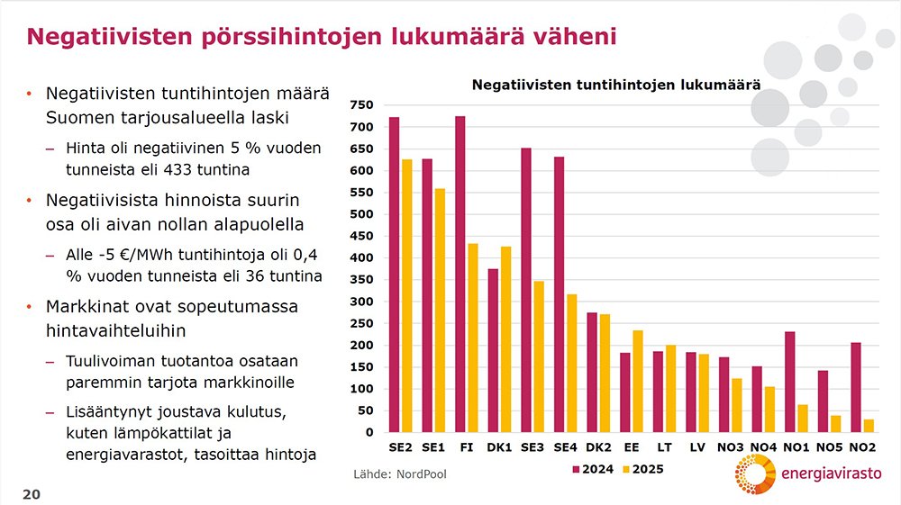 Viime vuonna negatiivisia pörssisähkötunteja oli vähän yli 400, kun vuotta aikaisemmin niitä oli noin 750. Lisäksi suurin osa negatiivista tunneista oli viime vuonna sellaisia, jolloin sähkön hinta asettui nollan tuntumaan, mutta ei sen alapuolelle.