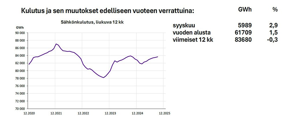 Muu sähkönkäyttö oli syyskuussa 3381 gigawattituntia. Tämä on peräti 10,2 prosenttia enemmän kuin viime vuoden syyskuussa. Toukokuun jälkeen muu kulutus on kasvanut 7–11 prosenttia joka kuukausi.