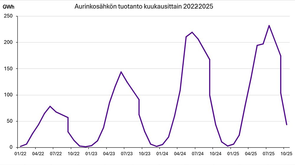 Aurinkosähkö on Suomessa selvästi kasvava energiamuoto. Sähkötilastot kertovat, että lokakuun loppuun päättyneen 12 kuukauden jaksolla aurinkosähköä tuotettiin 1203 gigawattituntia — lähes viisi prosenttia enemmän kuin vuosi sitten vastaavalla jaksolla.
