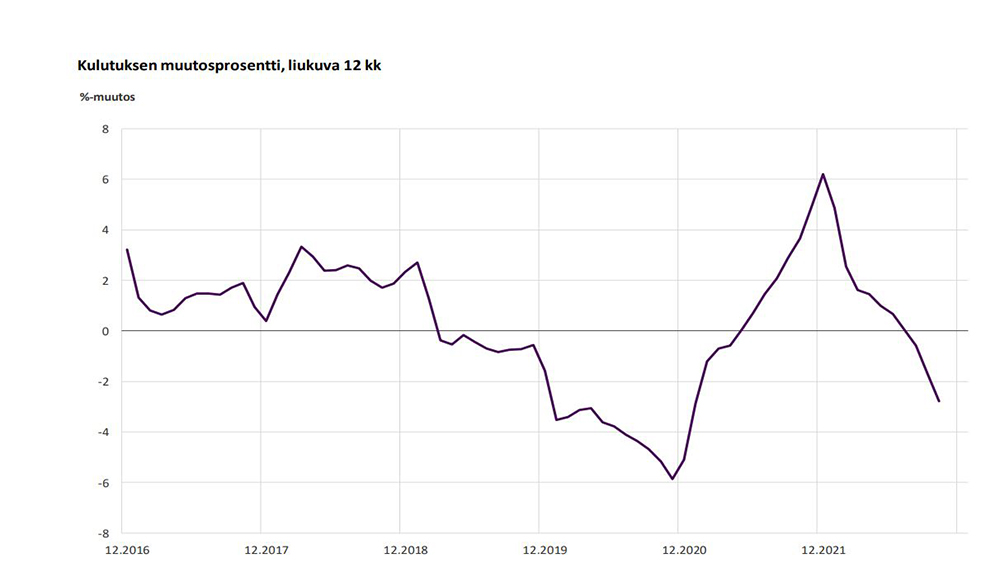 Sähkönkäytön muutokset, liukuva 12 kuukautta.